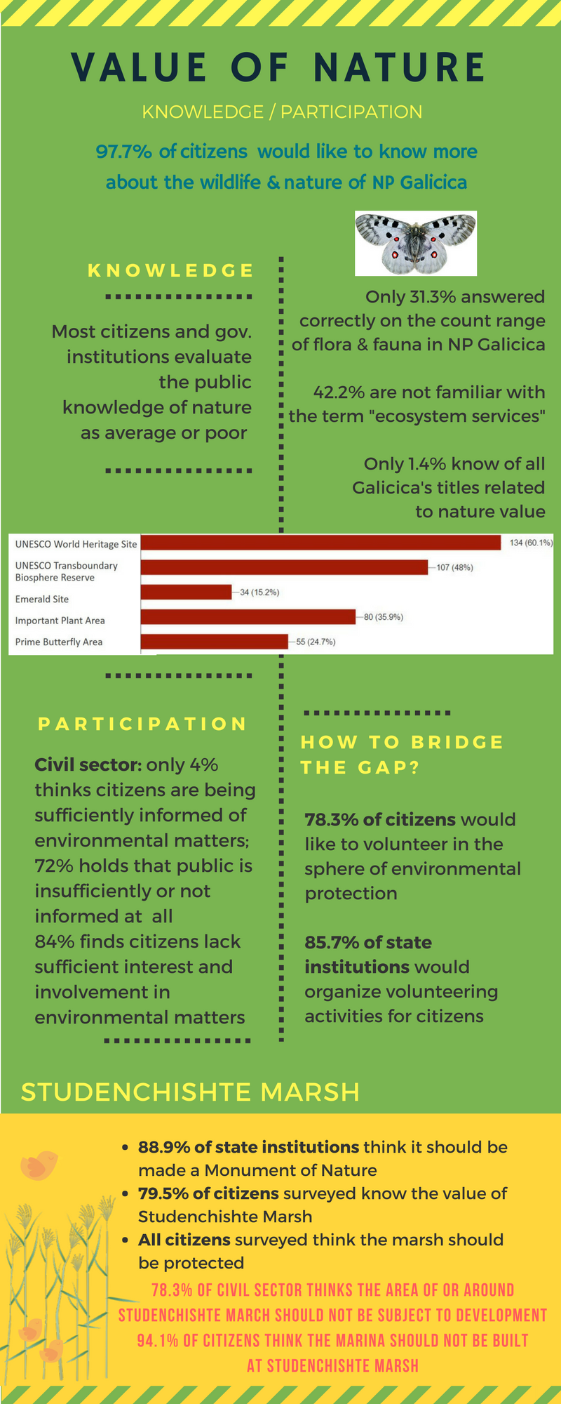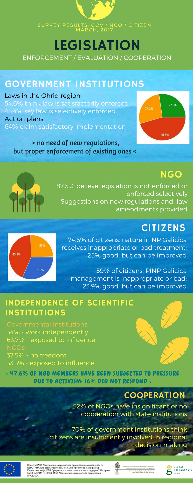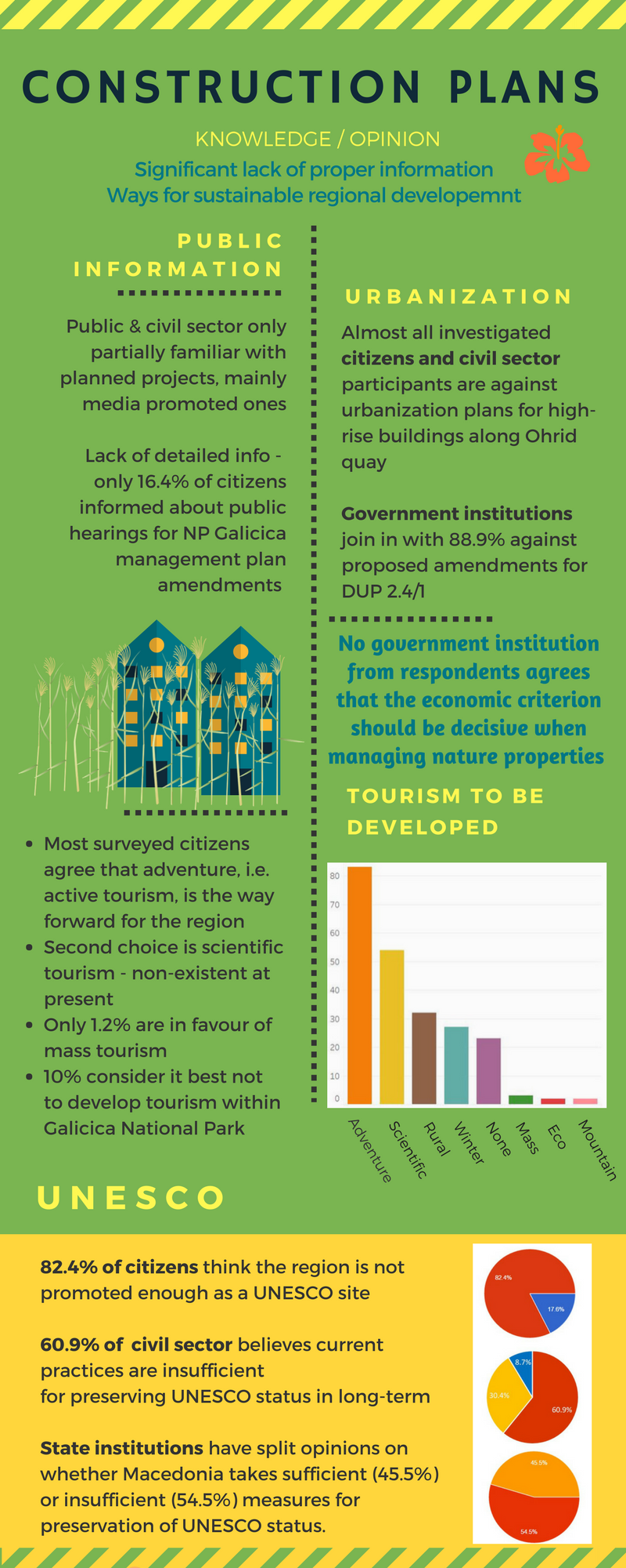 Во однос на предложените инфраструктурни проекти за охридско-преспанскиот регион, во март и април 2017 беа спроведени и три поединечни анкети со засегнатите страни кои беа дистрибуирани преку интернет и директно. Целта на анкетата беше да се добие што поверодостојно сознание за знаењето на локалните жители за природните вредности на регионот, планираните проекти како и упатеноста на локалните организации во истите, нивниот ангажман во областа на животната средина, соработка со институциите и инволвираноста на граѓаните, ставот на институциите во однос на насоките на планиран разбој, предвидените проекти, условите за работа, законодавството, заштитата на регионот итн. По извршената анализа на резултатите, наодите беа презентирани на завршна средба со сите чинители во април, 2017.